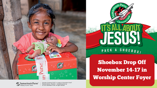 Pick up a box and packing guide in the Welcome Center lobby, and return your completed boxes by November 16th. Let’s come together to bless children across the globe and share the good news of Jesus this Christmas season.