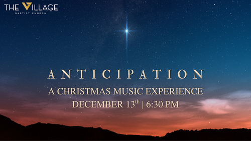 We are excited to invite our community to come and be a part of our Village Community Christmas musical, Anticipation! Come and experience an evening of worship in awe and wonder of our Lord and Savior's birth while cozying up around the piano. Enjoy the sounds of musical performances from the choir at Village Baptist Church as well as appearances from members of our youth and kids choirs. Bring your family and friends, settle in for an evening of praise and worship with our community to celebrate the Anticipation of Jesus' arrival!